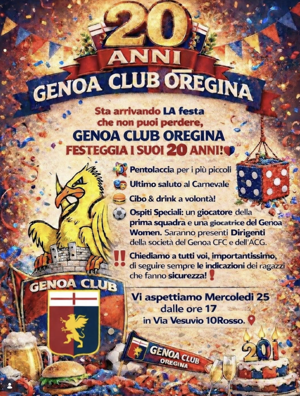 Nella giornata di domani, mercoledì 25 febbraio, ci sarà invece la festa per i 20 anni del Genoa Club Oregina. Prevista anche qui la presenza di un giocatore e di una giocatrice delle due prime squadre rossoblù. L’inizio della festa è previsto a partire dalle ore 17. Di seguito la locandina col programma completo: