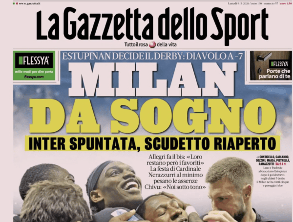 GAZZETTA DELLO SPORT – “Roma stop, ride solo De Rossi” titola stamane la Gazzetta dello Sport, che prosegue: “Gasp KO col Genoa. Corsa Champions più complicata. Colpo salvezza del Grifone“. La moviola, che consegna anche in questo caso un cinque e mezzo all’arbitro Colombo, parla di rigore netto per il Genoa e di “molti dubbi” per il tocco di braccio di Malinovskyi. Tornando ai temi legati alla partita, si legge: “De Rossi, una vittoria speciale. “Genoa coraggioso, avanti così“. Si parla anche di “furia Gasperini” in riferimento al rigore che reputa mancante per la sua Roma. “Se il VAR non lo vede, cambi mestiere” ha dichiarato l’allenatore giallorosso.