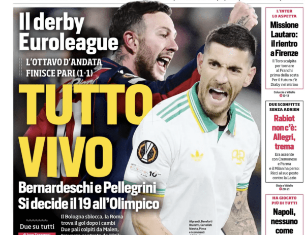 TUTTOSPORT – “Verona-Genoa: scintille. Baldanzi resta in dubbio” titola infine Tuttosport, che parla di “tabù trasferte” per la formazione di mister De Rossi, che non vince dalla trasferta di Udine dell’8 dicembre scorso.