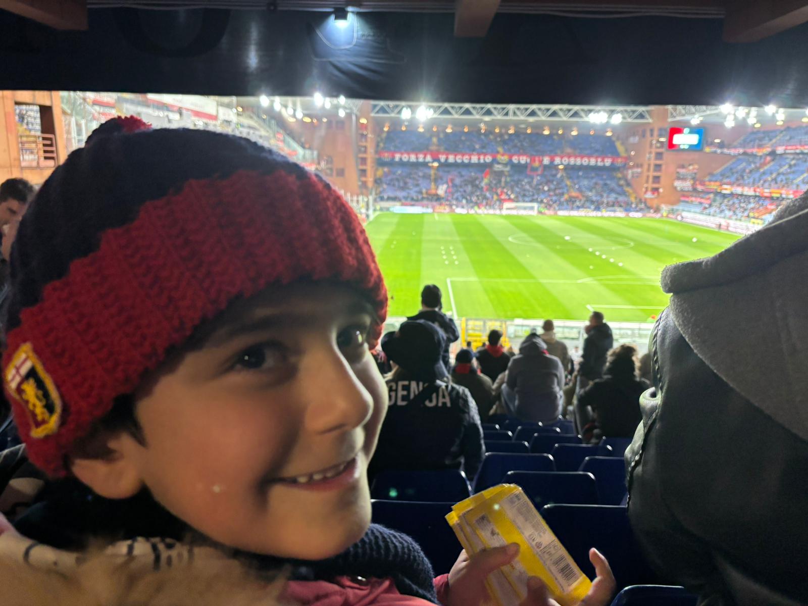 Una volta a Genova, dopo una cena da Romoli assieme ad altri iscritti del Genoa Club “Grifoni del Conero” (club che raduna lontano dalla Liguria un sodalizio assai nutrito di supporter del Grifone che arrivano non solo da Ancona, ma anche da Sinigaglia, Macerata, Osimo e molte altre località delle Marche), ecco la prima volta di Tobia al Ferraris. La prima volta, per Tobia, di varcare le porte dello stadio rossoblù. Un messaggio bellissimo in un momento in cui il calcio, in Italia, è spesso in mano al marketing forsennato, agli addii alla tradizione più pura di un club e alla mancanza di valori veri, forti, da tradurre in campo, in linea con le aspettative del tifo.