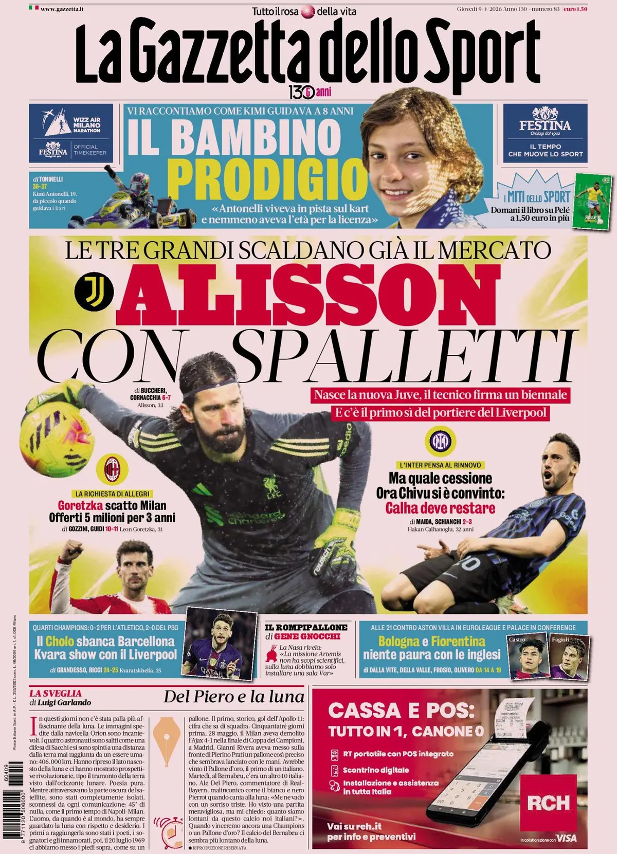 Nella parte di quotidiano destinata agli approfondimenti sportivi e calcistici si legge: “De Rossi e Grosso, i sopravvissuti della gloria azzurra di Berlino 2006“. De Rossi e Grosso vengono dipinti come gli unici reduci, ad alti livelli, di quella trionfale cavalcata a Berlino dopo i recenti passi falsi di Gilardino a Pisa, di Gattuso e Buffon in Nazionale e, qualche anno fa, di Pirlo, ora ad allenare negli Emirati Arabi. Per il quotidiano, per domenica contro il Sassuolo restano in dubbio Norton–Cuffy, Onana e Cornet, ieri ancora a parte. Da segnalare, infine, un’intervista all’ex rossoblù e neroverde Manfredini.