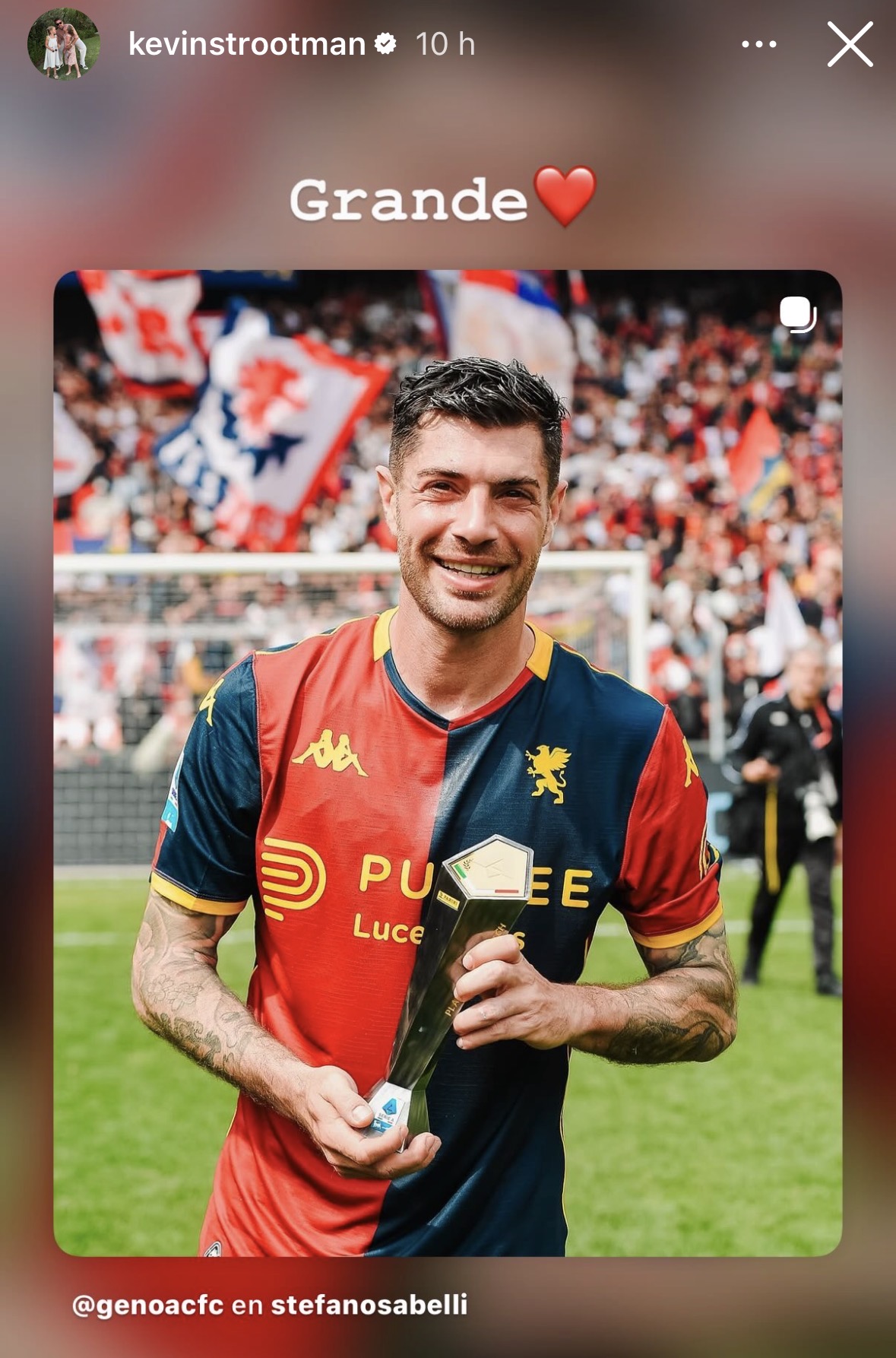 Un tifoso in più, insomma, che ha nel suo passato calcistico anche un rapporto intenso con De Rossi, oggi alla guida del Grifone. Kevin Strootman ha ricondiviso la foto di Sabelli col titolo di MVP e ha scritto un “Grande!” nelle proprie storie social. Qui di seguito la foto.