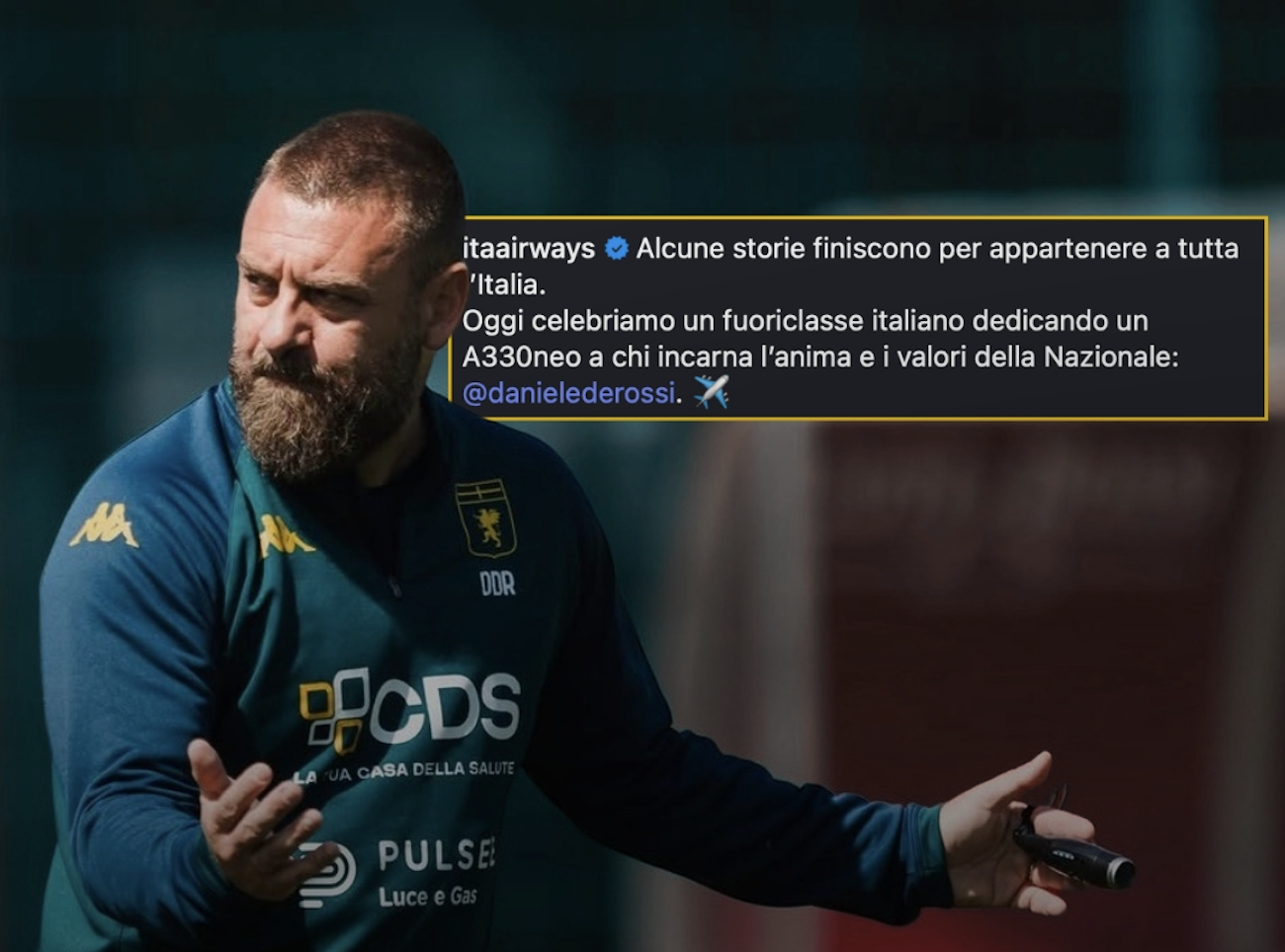 Voi vi chiederete: che c’entra la compagnia aerea di bandieri, ITA Airways, con Daniele De Rossi, allenatore del Genoa? C’entra eccome se questa compagnia si chiama ITA Airways e se De Rossi viene scelto dalla medesima compagnia di bandiera come simbolo della nazione italiana, come figura che incarna un senso di appartenenza forte con l’Italia.