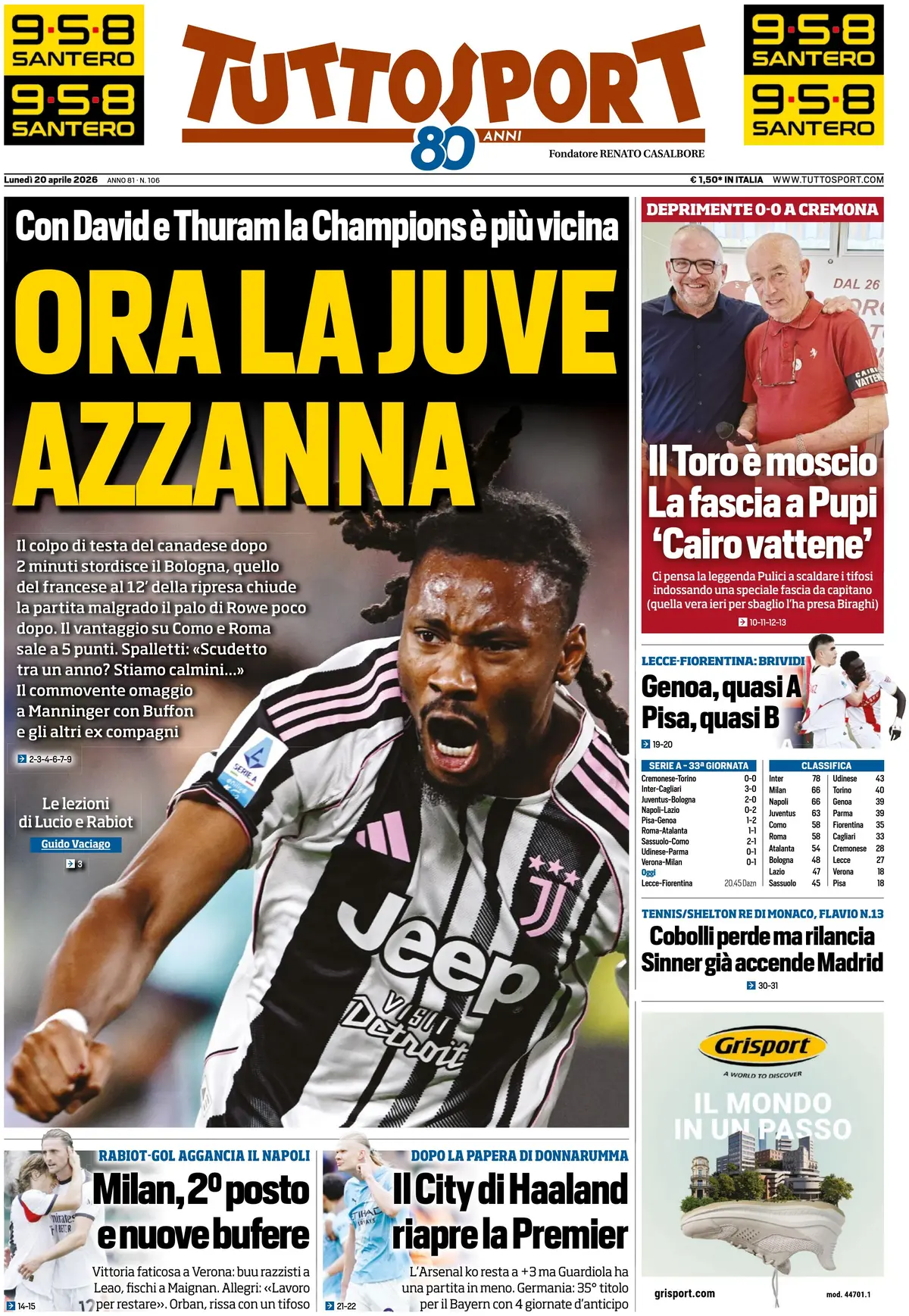 GAZZETTA DELLO SPORT – “Genoa, adesso è fatta” titola a sua volta la Gazzetta dello Sport, che aggiunge: “Ekhator e Colombo. De Rossi si salva e affonda il Pisa“. Segue un’analisi approfondita della sfida dell’Arena Garibaldi. Anche qui va segnalata la valutazione positiva dell’arbitro Crezzini, soprattutto nella valutazione del rigore a favore ad inizio ripresa. Voto sei.